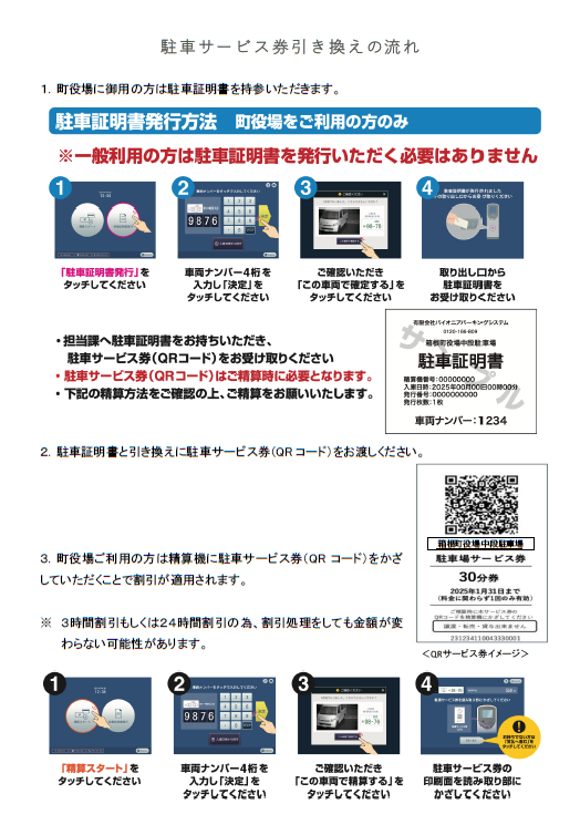 各窓口へ相談や手続きのために役場へお越しになった方には、駐車料金の減免サービスがあります。駐車時に精算機にて駐車証明書を発行のうえ、ご利用の窓口で駐車証明書と引き換えに駐車場サービス券をお受け取り下さい。
